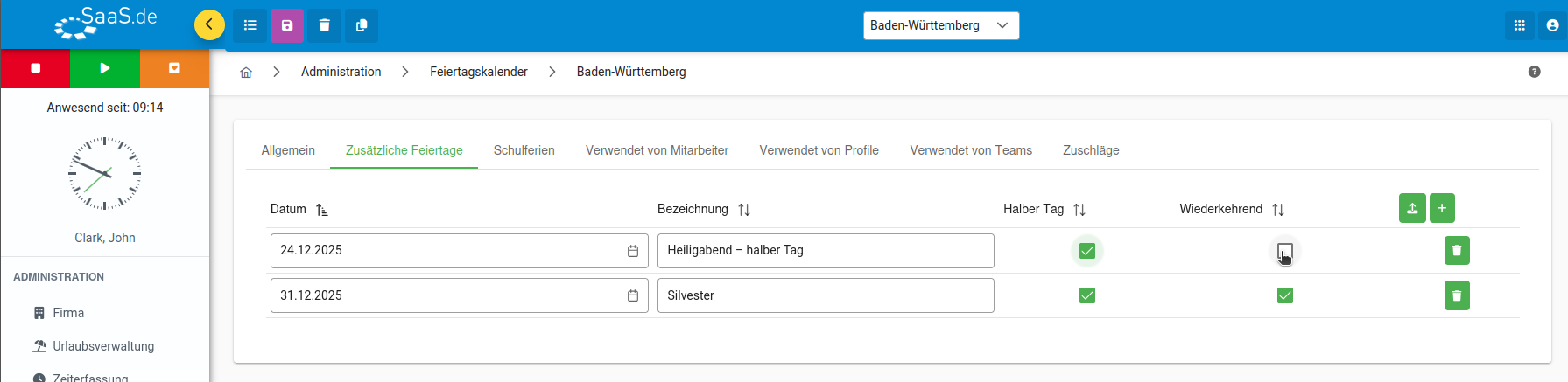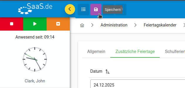 At the end of the year in particular, our support team receives many enquiries about additional or half public holidays, such as Christmas Eve and New Year's Eve. As these days are not public holidays in Germany, they have to be created manually in the public holiday calendar in SaaS.de.