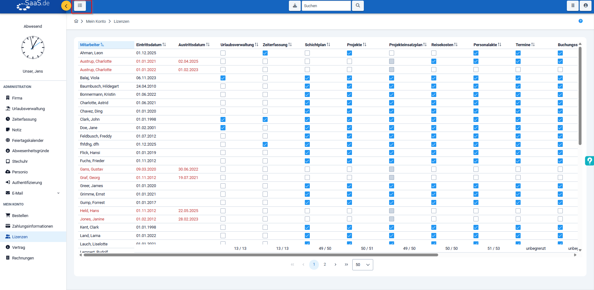 Cliquez sur le bouton "Archives" au-dessus pour afficher les collaborateurs qui ont quitté l'entreprise. - Supprimez la licence de l'employé qui a quitté l'entreprise en décochant la case correspondante.
